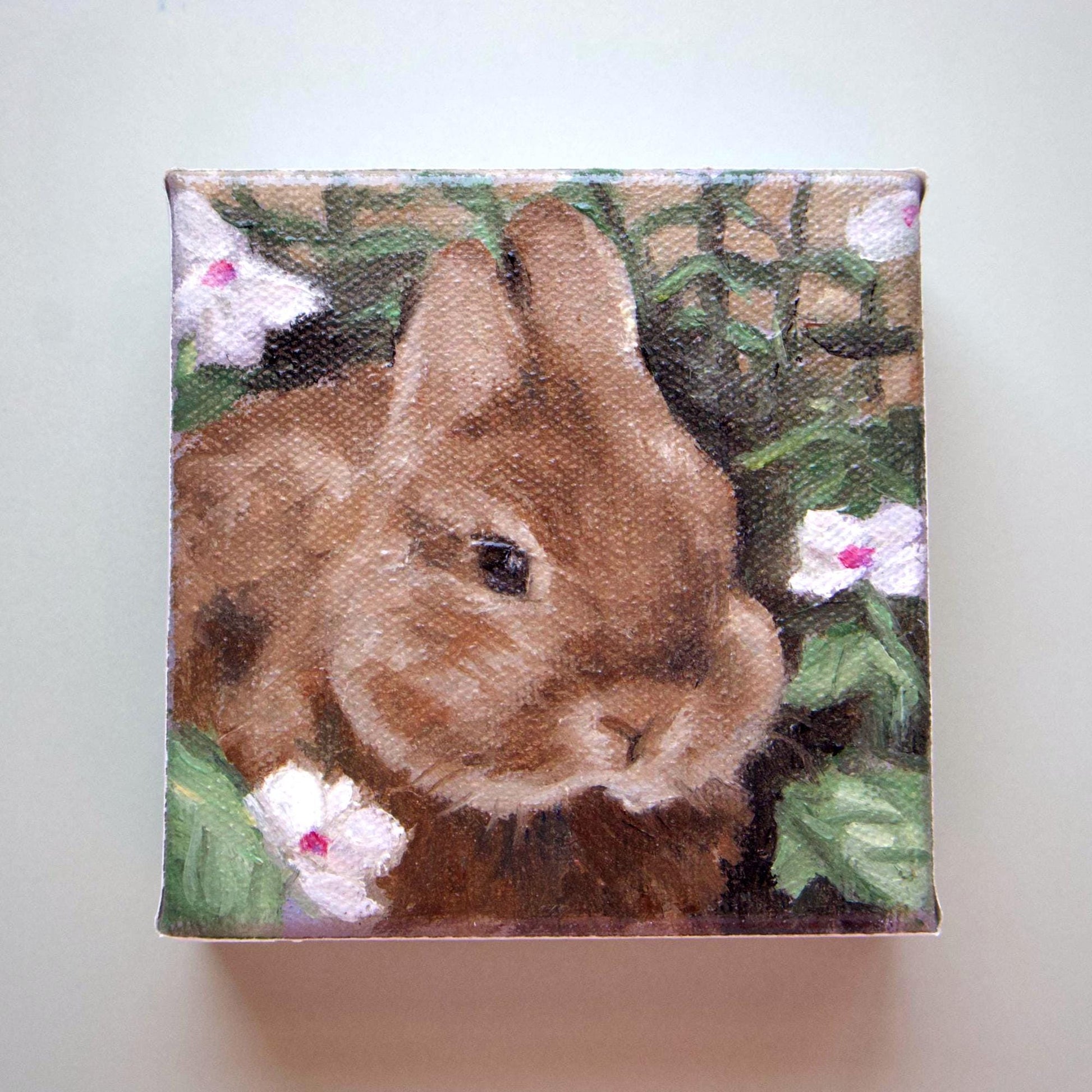 Beautiful one of a kind oil painting of a small bunny lounging in a patch of flowers.