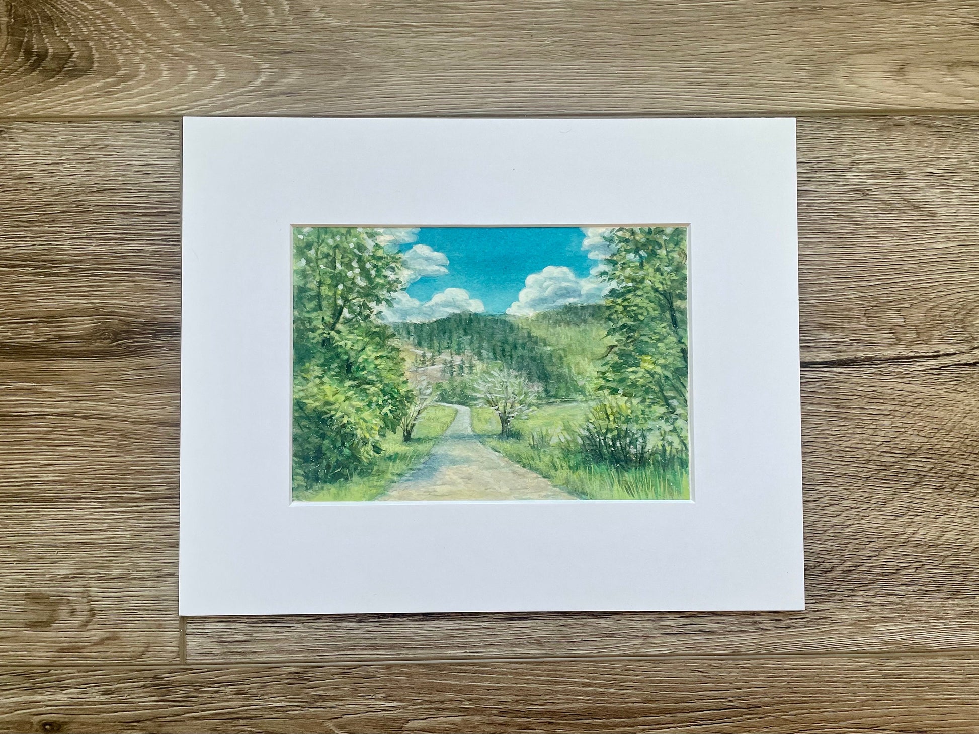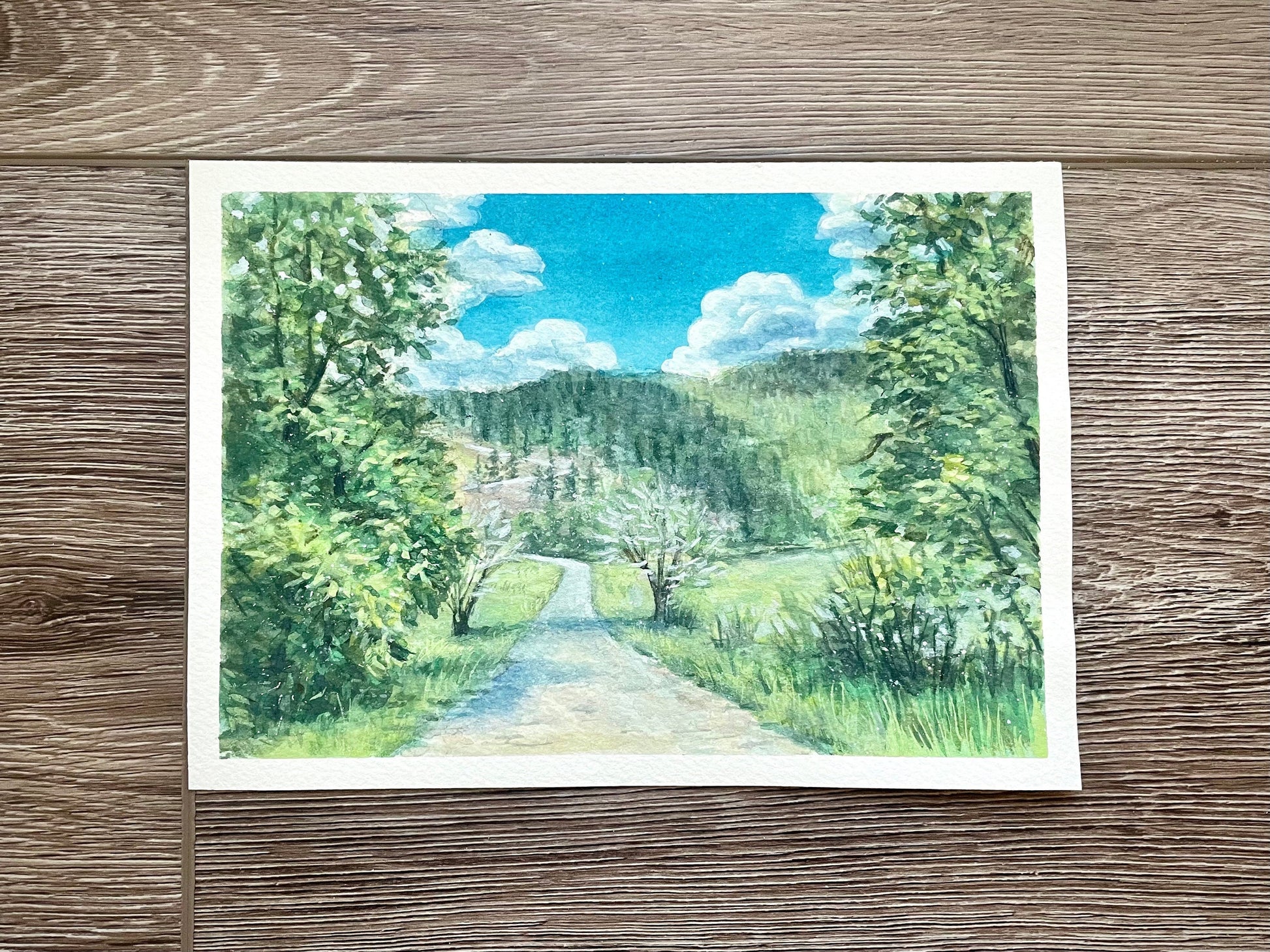 Landscape original artwork scenery of forest and mountain hill with watercolor and gouache hand painted by artist