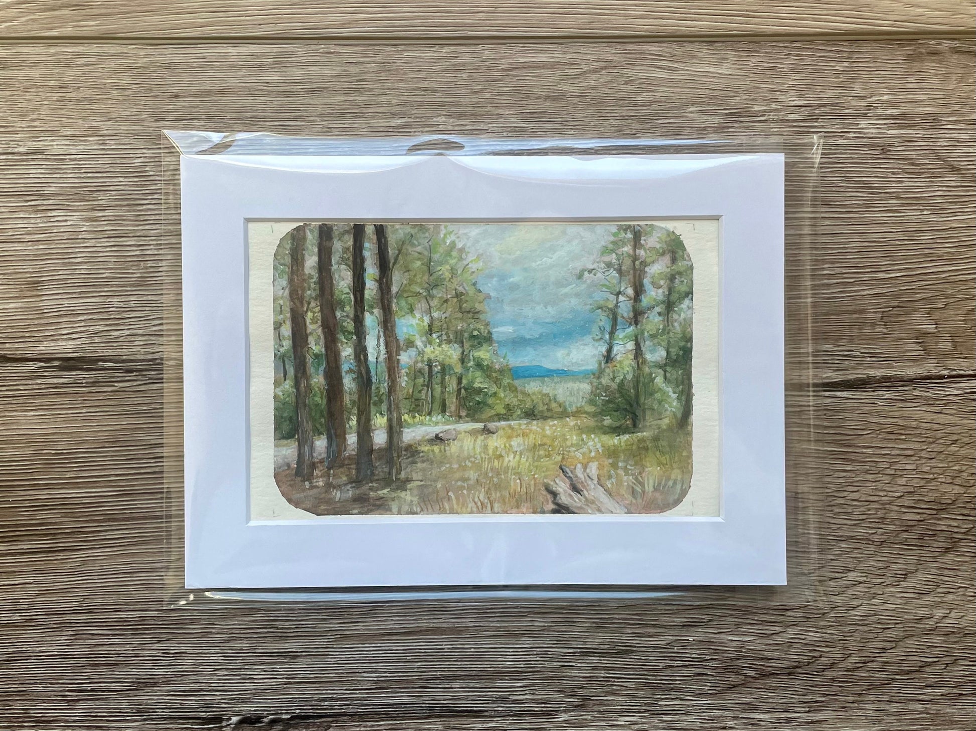A sweet little (6in.x4.5in.) scenery of a beautiful landscape hidden in the mountains of Jemez, New Mexico. Painted in a mix of watercolor and gouache.